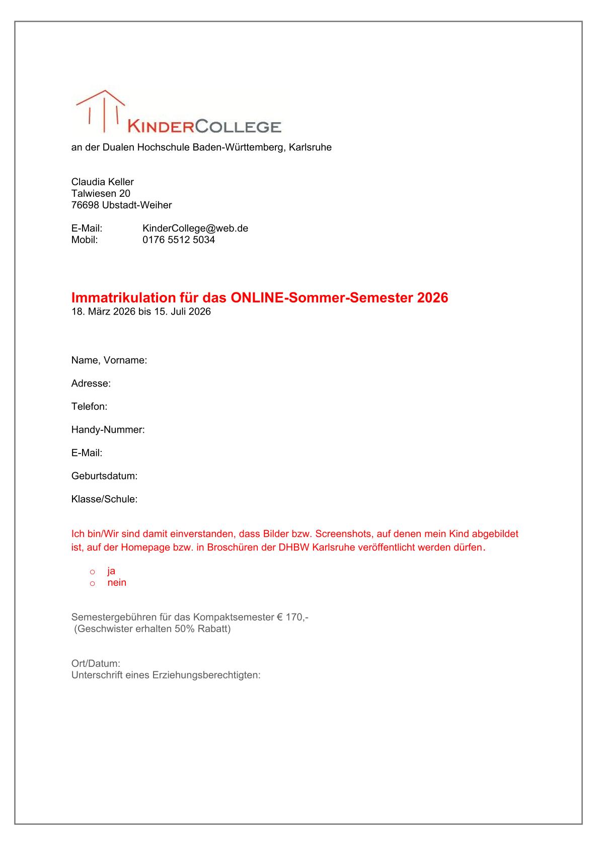 Neugier ist der Motor des Lernens – und genau daran knüpft das KinderCollege der DHBW Karlsruhe an. Seit 2014 erhalten Kinder zwischen 8 und 15 Jahren dort die Möglichkeit, einmal pro Woche in die Welt der Wissenschaft einzutauchen. Mit großer Begeisterung besuchen die jungen „Studierenden“ ihren eigenen kleinen Studiengang und beschäftigen sich mit spannenden Themen aus ganz unterschiedlichen Wissensgebieten.Wir freuen uns, wenn viele unserer Schülerinnen und Schüler diese besondere Chance nutzen und Teil der KinderCollege‑Gemeinschaft werden.